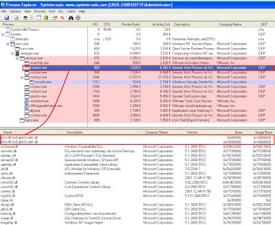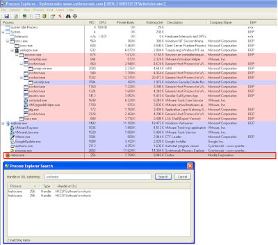 The Trojan has loaded a malicious version of a Firefox process, to effectively hide itself from users. After all, who would suspect a Firefox process to be malicious? You can search for Handles or DLLs via the menu Find. Svchosts.exe is the Trojan on itself, which we will see below. Note: for this reason, the Trojan has rootkit capabilities, which we will discuss in the next case study.