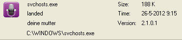 --> the legit file is named svchost.exeand resides in C:\Windows\system32--> most, but not all, malware hides in C:\Windows or C:\Windows\system32 - The file description reads “deine mutter”--> which is German for “your mother” and is considered an insult in some countries