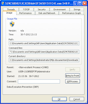 This malware hides in %appdata%, which is a system variable for the Application Data folder of the currently logged on user. What else can we deduct from this screenshot? The rogueware uses a Microsoft icon, thus trying to trick the user to indicate it’s nothing malicious. An effective trick indeed, but considering the previous factors, we can be sure this is a malicious process which needs to be terminated.